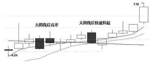 在 股价缓慢推升至或震荡走高至60日均线上方时,由于大盘原因或主力刻意洗盘而出现几乎没有下影线的大阴线,形态极为恶劣。但股价第二天会高开或快速拉 起,并不给散户抄底机会。这种形态显示了主力持筹不多,有急切拉高心理,不会进行较长时间或较为深幅的打压洗盘,一般选择市场合适机会快速拉高股价。这种 形态多与星线配合。实战图例: