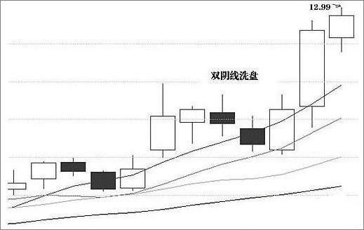 这种洗盘形态是股价在一波上涨之后,主 力在前期头部反向利用传统K线分析方法 双飞乌鸦 制造的洗盘陷阱。其形态 意义上,前面没有出现天量大阳线或吸引跟 风的走势,盘口显示较轻,但突然高位收阴,并在第二天低开低走,且收出近似光脚的阴线。这是一种快速的洗盘方法,随后则以大阳线连续拉抬,甚至连续地涨 停。这是一种较狠的主力操盘手法。实战图例: