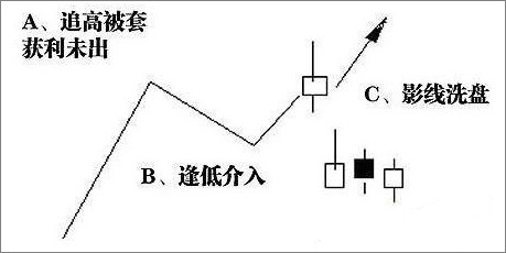 影线洗盘是主力借助前期高点之势和影线之形而实施的一种上影线的洗盘技巧,其不但消化了 前期被套盘,且由于其在形态上呈现的在前期小高点处短期头部之特 征,迫使抄底资金离场出局,而后股价快速拉起。图2-1C处的长长的影线对于前期被套及获利未出局者有着强烈的吸引力,对于图2-1B处介入者利用其恐惧 心理使其出局。充分清洗了浮动筹码。