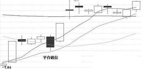 个股经过下跌或调整后,抛盘逐渐枯竭,在60日均线下走出小平台走势(窄幅横盘),之后突然出现大阴线破位,或连续的几根大阴线打破平台位置,这种形态多是主力诱空陷阱,随后股价快速拉升。实战图例: