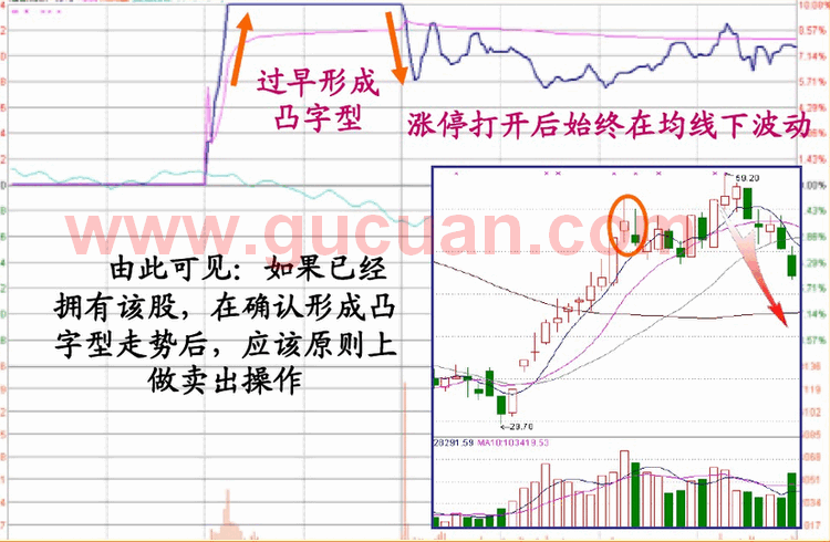 二、凸字型涨停板 凸字型涨停板是指股价封住涨停后,又重新被打开直至收盘都没有再次封上涨停板的走势,其形象一个凸字形走势。该涨停大多为出货型涨停。