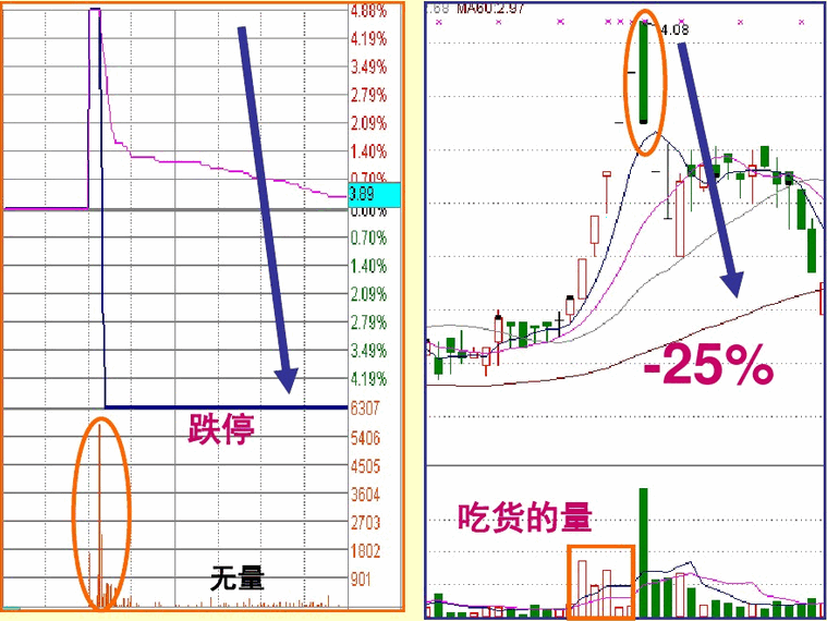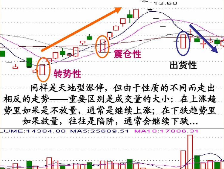 在下跌趋势中的天地型涨停板,只要放出巨量,不仅不能马上上涨,往往反而会继续下跌 这是因为庄家为了吸引市场接盘,故意运用对倒盘造成有抄底资金进场的假象,当跟风蜂拥而入后,第二天继续以跌停板开盘,并以大单封死,把跟风者悉数套牢,而后通过连续地大幅下跌,远远摆脱套牢盘再在低位寻机震荡出货。