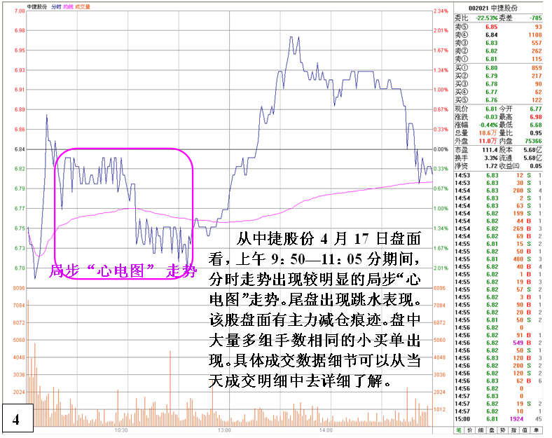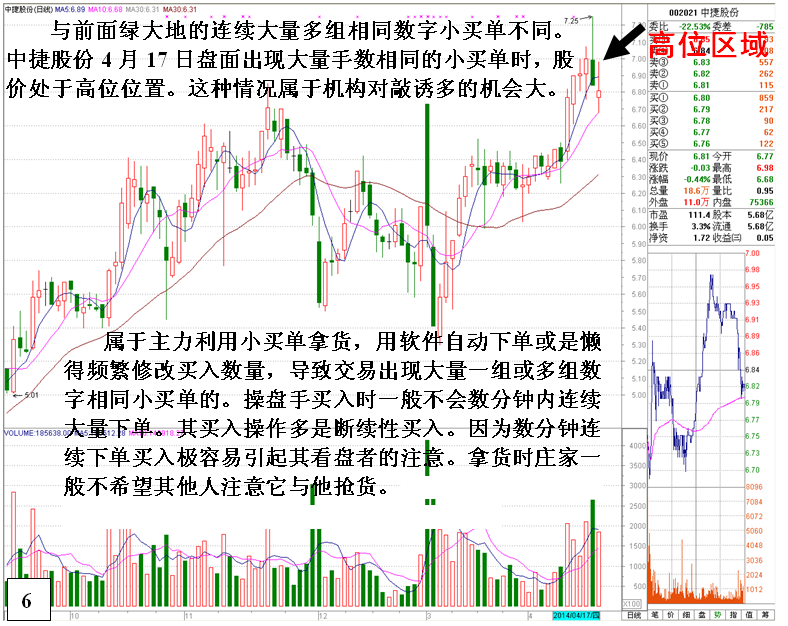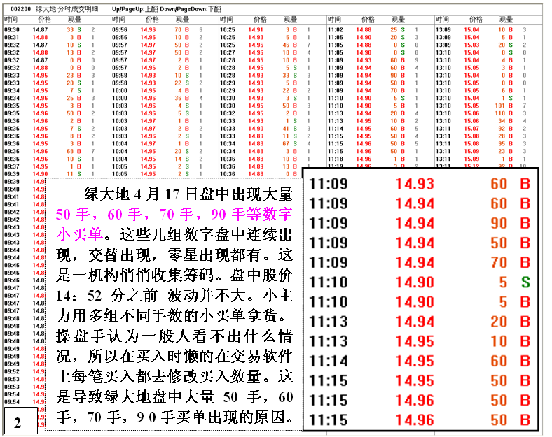 下面以〔002200〕绿大地和〔002021〕中捷股份为列,介介绍绍两种手数相同的小买单拿货与对敲情况。