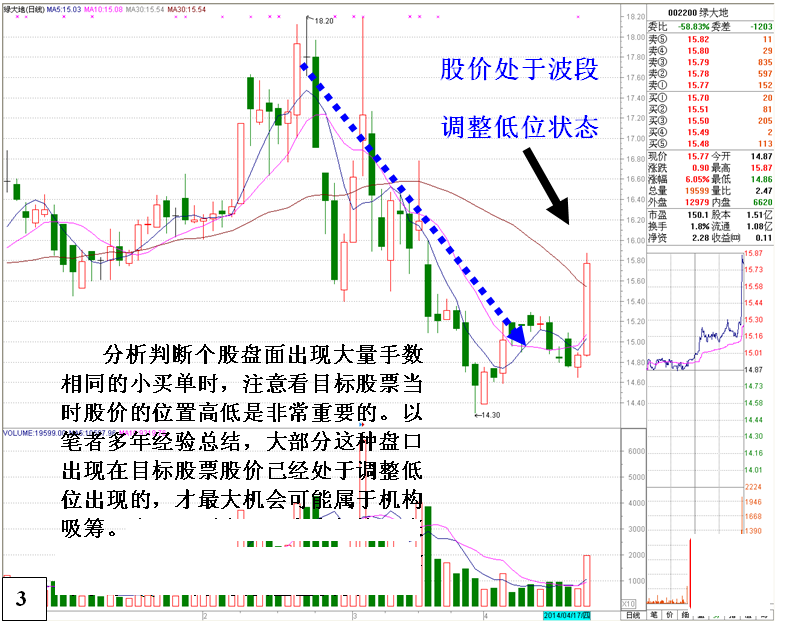 ③看目标股票盘中盘口与分时表现,一般机构或大户不会明显操纵股价。如是大主力在活动用大量小买单交易,盘中明显操纵股价的机会较大。