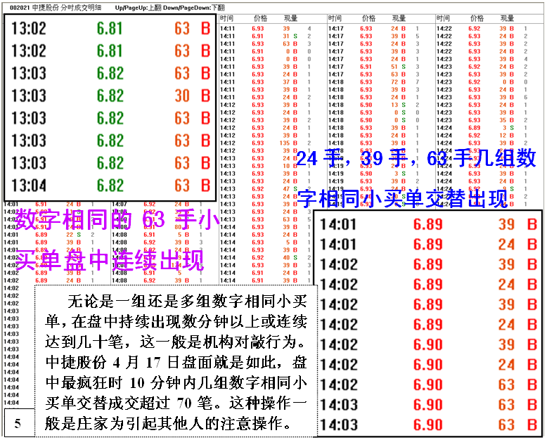 其中某一天或某一段时间内,成交出现一组或多组手数同样的小买单有规律大量出现就是一种。这种规律成交盘口成因有多种:交易软件代替人工交易下单,下单员在软件上将买卖参数设置好后软件实施自动不断交易。机构操盘手人工交易下单,在交易软件上写好数量后不断点确认键下单买卖懒得修改。有时一些机构故意在交易时制造大量手数相同的买卖单引起他人的注意。另外一些大户无聊,在操作时以带有玩的心态用相同手数的买卖单去交易。