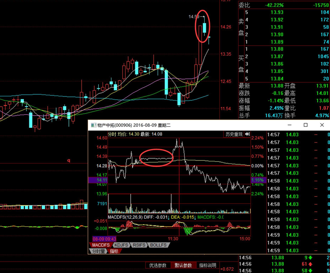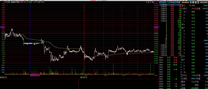 这是佳隆,昨天的超级盘口和明天的走势。我就是在圈中这个位置,一看主力想减仓,不好玩,我就直接把单砸给主力,开溜了。