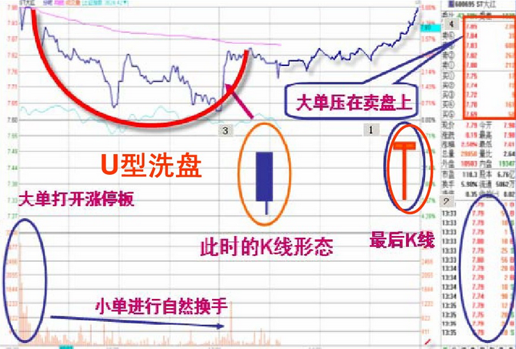 无论是先 U 型后拱型,还是先拱型后 U 型,都是一种复合型洗盘形态,其目的是要把获利盘和解套盘同时洗出来,这与单纯的 U 型主要洗出获利盘和单纯的拱形主要洗出套牢盘的盘口有所不同 其大单成交要相对多一些,上下压盘也要频繁一些。