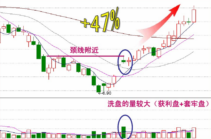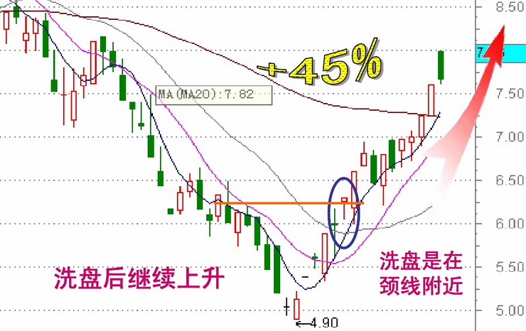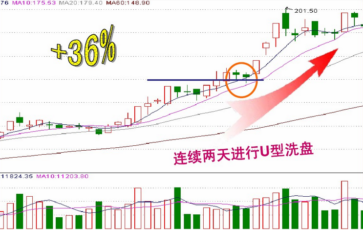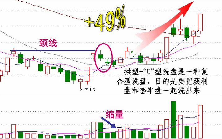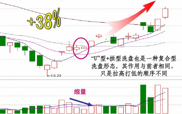 U 型洗盘的重心大多向下,其主要目的是想洗出获利盘;拱形洗盘的重心大多向上,其主要目的是想洗出套牢盘 两者区别是:拱形洗盘往往在K线形态的颈线处,成交量放得较大;而 U 型洗盘则多为上升通道中,成交量不是很大。