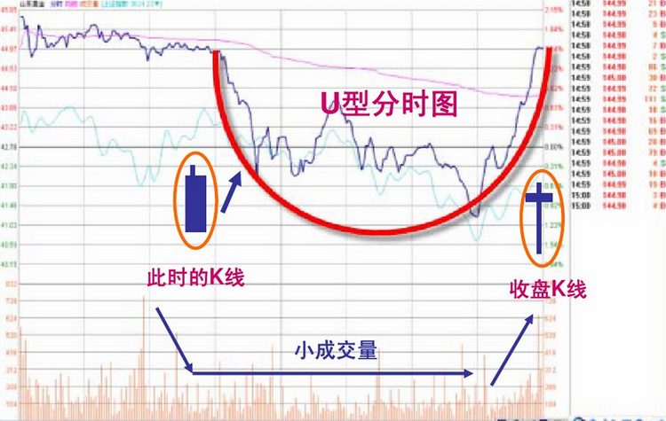 U 型洗盘是指股价全天走出一种:高开 低走 再高收的分时走势。盘口特征多为大单打穿关键价位,小单进行非密集式成交,大单呈现出挂而不交的盘口景象。