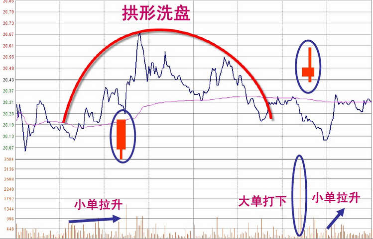 拱型洗盘是指股价全天走出一种:低开 高走 再低收的分时走势。盘口特征多为小单拉高、大单打低,打低的目的是为了吓出获利盘,上下买卖均成小单景象。