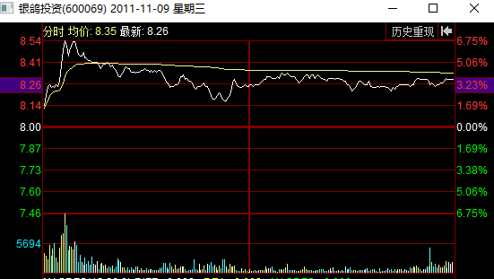 如图所示,银鸽投资(600069)在2011年11月8日的盘面走势图。该股当日跳空高开,随后上行,成交量较为活跃,在高位震荡后有所下跌,但在下跌到前一日收盘价附近时有资金进场吸货。结合上述分析的几种情况和其前期走势,可推断主力在此吸筹的可能性较大。