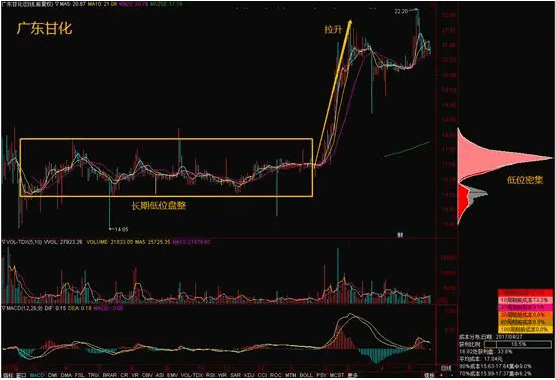 底位密集形态一般出现在底部横盘的阶段,说明主力在底部充分收集筹码,市场成本集中在相对低的价格。如果股价向上运行,只有获利盘的抛压,而几乎没有解套盘的抛压。假如该股真的有主力在底部收集筹码,那么此时拉升股价,获利盘中大部分都是主力的筹码,抛压也不会很大。而且,能够接受长时间底部盘整而不卖出的投资者,一般也是比较有耐心的投资者,大部分不会满足于十几二十几个点的涨幅,所以这些筹码也相对稳定。如果主力在拉升之前再来一些试盘和洗盘的动作,那很大概率回来一波不错的上涨