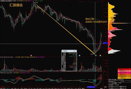 一般来讲,筹码分散状态出现在上涨或下跌的过程中,或者是横盘吸筹的初级阶段,这个时候市场的成交相对分散,筹码分散。比如在下跌的过程中,显示出筹码分散的状态,说明在每个价格段,都有大量的成交,如果抛开主力对倒的情况,那说明有不少资金在下跌过程中抄底,而且出现亏损,那么这个时候,无论是下跌还是上涨,都会面临很大的抛压,对于股价的运行都是不利的。所以,当筹码出现分散状态时,我们一定要多观察,如果是中长线操作,尽量先观望,如果是短线操作,还需要从其他的方面来考察