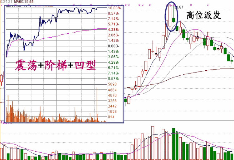 4.在较高的价位(任何K线形态)的放量涨停,都可视为出货性质的涨停 其涨停形态为震荡型涨停、斜刺型涨停和凸字型涨停。