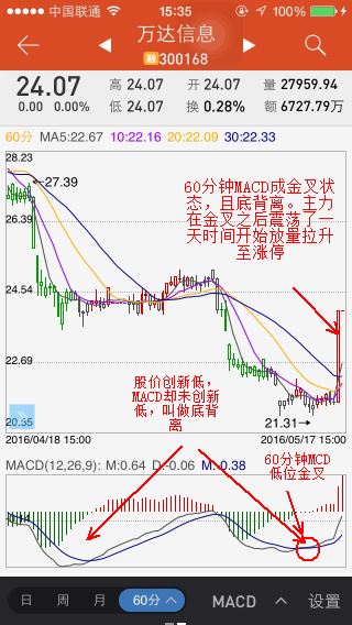 今天介绍如何用60分钟MACD金叉法选择买点。大家都知晓日K线MACD低位金叉是买入点,但是往往大涨后才形成MACD金叉,相对比较滞后;但是60分钟MACD金叉比日K线MACD金叉更加灵敏,能够提前布局并享受到更多的利润。