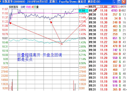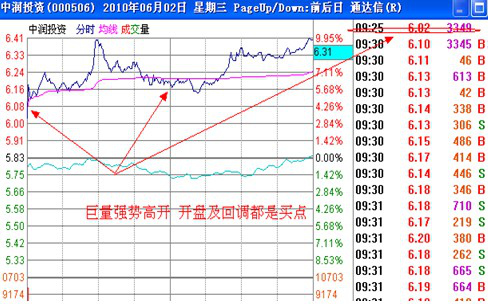 4、 开盘一小时股价处于强势中,回调不破开盘价、均价线或前日收盘价
