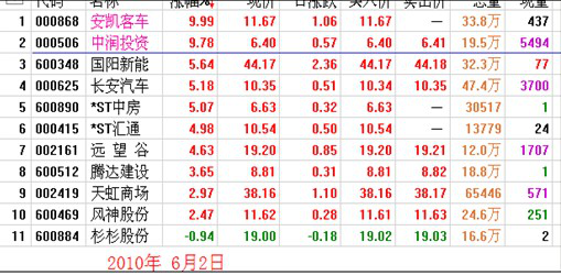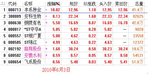 从上面看,这两日涨停的个股包括ST股在内大约占总数的40%左右,这和我多次检验的结果大体是一致的,这里不是来炫耀,而是告诉大家资金要均匀分配,不要孤注一掷,如6月3日,符合巨量高开标准的九档个股你如果分散资金买入,那么总收益就有3%(九档个股平均涨幅近5%),但如果你孤注一掷只买600502,开盘价8.80元,收盘价是8.57元,这样你却是亏损的,所以合理分配资金获取总体稳定的收益是极其重要的。