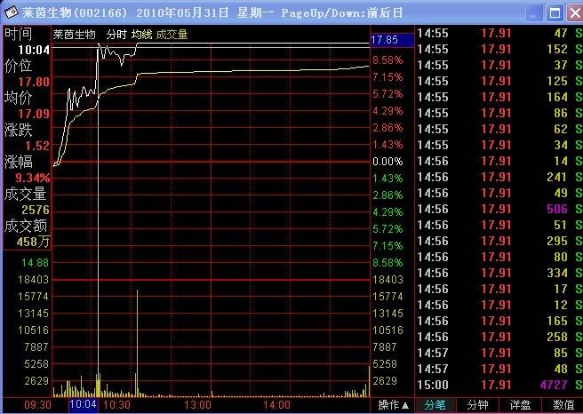 莱茵生物2010年5月31日分时走势图: