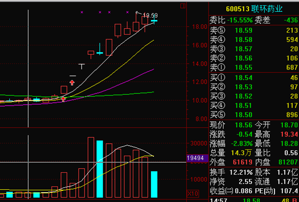 注解:盘整要求在至少5到6天内没有出现大阴大阳,均线系统不能出现BIAS太大的情况,拉到涨停的位置后离强阻力区域不能太近,要给第二天的高开留下一定空间;对于庄家持仓太重、基本只有庄家自己参与交易的股票,首先必须看日K线,判断一下庄家这时的意图,再决定是否参与。在一般情况下,盘整后突破的股票是最好的,由于普遍的心理预期是突破后上涨空间打开,第二天的获利幅度会大一些;而对于超跌反弹的股票,由于反弹性质决定,高度不能预计太大,要保守一些。而连续上攻的股票,由于在低位买进的人可能随时抛出,形成大抛压,因此除非是在大牛市,否则追涨停的时候一定要小心。而对于庄家仓位比较重的股票,庄家由于出货需要,常常是在涨停后继续拉高出货,才能降低仓位,所以反而相对安全些,当然具体情况要求大盘不能太差。由于个股形态分析需要较好的功底,在这里,请自己去看看相关资料,自己体会。在这里最强调一点,就是即使今天涨停,这两天的获利盘依然不多,最好是洗盘后上攻涨停。
