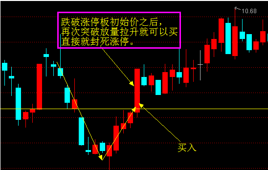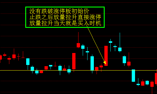 那么如果不跌破主力的成本一旦在涨停板的初始价附件出现止跌收阳,放量拉升的话,那么就是买股时机,买入就涨停。