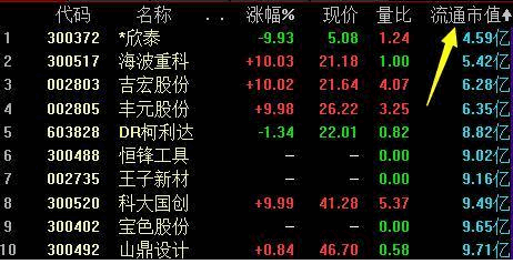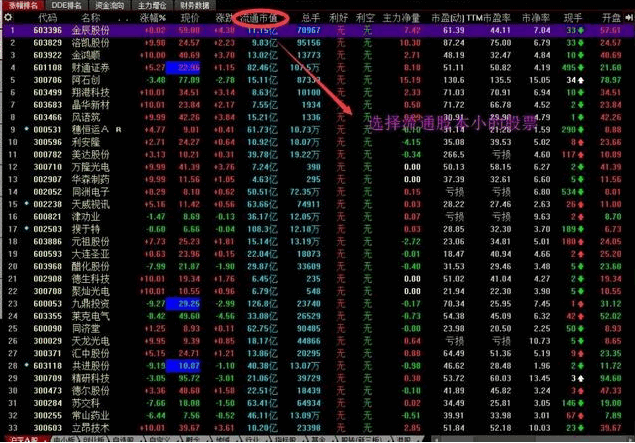 2、批量剔除:把这些股票都加入自选股之后,通常还会剩50只左右。这时候,剔除掉流通市值大于100亿的股票,盘子太大就容易冲高回落,尽量规避。