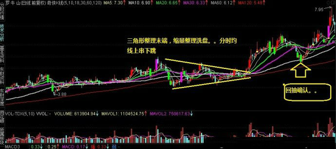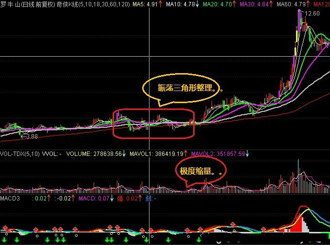 其三,走势震荡成交萎缩的股票。K线走势起伏不定,而分时走势图剧烈震荡,成交量极度萎缩。庄家到了收集末期,为了洗掉短线获利盘,消磨散户持股信心,便用少量筹码做图。从日K线上看,股价起伏不定,一会儿到了浪尖,一会儿到了谷底,但股价总是冲不破箱顶也跌不破箱底。而当日分时走势图上更是大幅震荡。委买、委卖之间价格差距也非常大,有时相差几分,有时相差几毛,给人一种莫名其妙、飘忽不定的感觉。成交量也极不规则,有时几分钟才成交一笔,有时十几分钟才成交一笔,分时走势图画出横线或竖线,形成矩形,成交量也极度萎缩。上档抛压极轻,下档支撑有力,浮动筹码极少。