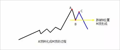 (上图)在A字顶形成的过程中,如果上冲到A点,遇到阻力被砸只有不大的跌幅,跌到B点后就开始再次向上挑战前高A点,但是到达C点却没能突破A高点或者只是稍稍刺破A高点就再一次被砸下来了,当下砸跌穿B点,则M顶形成。这样就是A顶转化成M顶的过程。