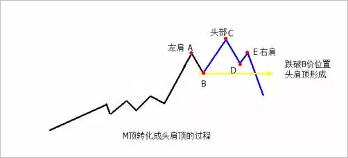 如果跌到D点并且B点没有被击穿(D点可以稍稍小幅击破B点),就再一次反弹去挑战前高点C,结果反弹的高点E没能突破前高C就被砸,一举跌破了B和D两个低点并继续下跌,则头肩顶形成。这样就是M顶转化成头肩顶的过程。