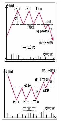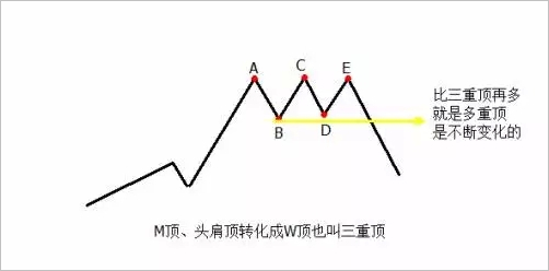 (上图)这里还有一种特殊的情况,就是形成头肩顶的过程中,三个高点A、C、E高度相差不大,没有发生中间C点明显高于A、E两个高点的情况,我们把这样的顶叫做三重顶,或者也可以形成的叫W顶。