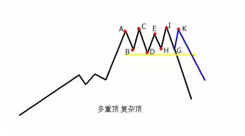 (上图)最常见的顶还有更复杂的多重顶,它也是由三重顶或者说W顶转化而来的。就是顶部高点不只有ACE三个,还有I、K可以是四个五个这样的高点,确认方法就是跌破B、D、H、G这些回调低点的最低点并继续下跌。这样就形成了多重顶。也叫做平顶。