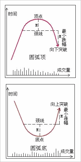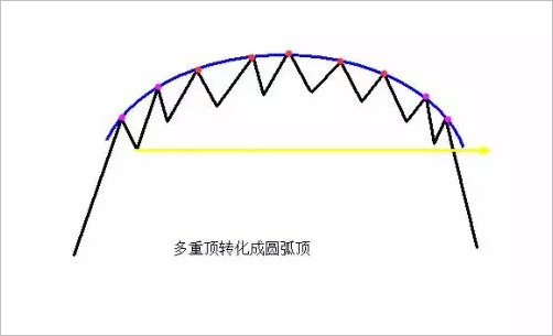 (上图)把红色点的高点单独拿出来,可以看作是多重顶或者是平顶,但是再加上粉色点处的高点,这些点相连可以看到形成了一个圆弧形,这样的形态我们称之为圆弧顶。