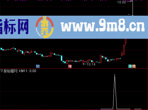 KM1赋值:上次收盘价/1日前的收盘价>=1.098距今天数 KM3赋值:KM1+2日内成交量(手)的最高值 KM4赋值:如果收阴线,返回成交量(手),否则返回无效数 KM5赋值:KM1日内KM4的最高值 KM6赋值:KM3/KM5>1.5 KM7赋值:KM1+1日前的收盘价 KM8赋值:KM1日内最高价的最高值 KM9赋值:(KM8-KM7)*0.382+KM7 N赋值:9 M赋值:9 A赋值:周期类型 BL赋值:如果A=0,返回150,否则返回如果A=1,返回50,否则返回如果A=2,返回30,否则返回如果A=3,返回17,否则返回如果A=4,返回15,否则返回如果A=5,返回8,否则返回如果A=6,返回3,否则返回如果A=7,返回2,否则返回如果A=8,返回50,否则返回如果A=9,返回3,否则返回1.3 FM赋值:(收盘价的1.414*N+1日指数移动平均) FCL赋值:如果FM<=0.05,返回FM的绝对值+0.1,否则返回0 DIF赋值:(收盘价的N日指数移动平均-收盘价的2*N+2日指数移动平均)/(FCL+FM)*100*BL,画淡红色,线宽为2 DEA赋值:DIF的N*0.75日指数移动平均,画绿色,线宽为2 MACD赋值:2*(DIF-DEA) KM10赋值:MACD的3日简单移动平均 输出KM11:最低价