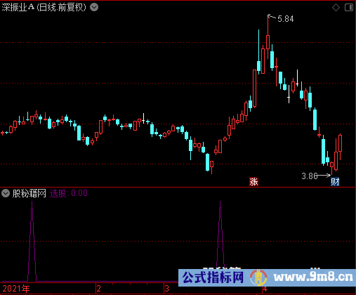 选股:CROSS(操盘,VAR300) AND VAR300<2.1 AND C>O,COLOR770077;