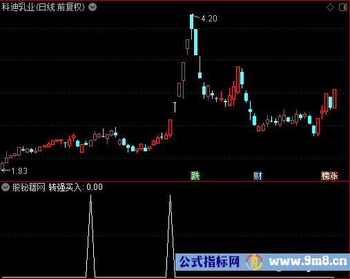 m6:=EMA(c,60);m7:=MA(c,78);m8:=Ema(m7,3);m9:=ema(m8,3);转强买入:CRoss(m6,m9);九毛八公式解读 M6赋值:收盘价的60日指数移动平均 M7赋值:收盘价的78日简单移动平均 M8赋值:M7的3日指数移动平均 M9赋值:M8的3日指数移动平均 输出转强买入:M6上穿M9