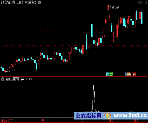 X_1赋值:收盘价/1日前的收盘价>1.095 AND 收盘价=30日内最高价的最高值 X_2赋值:上次X_1距今天数 X_3赋值:收盘价的5日简单移动平均 X_4赋值:收盘价的30日简单移动平均 X_5赋值:(2*收盘价+最高价+最低价)/4的5日简单移动平均 X_6赋值:X_5*(200-102)/100 X_7赋值:最低价<1日前的最低价 X_8赋值:最低价/1日前的收盘价<0.97 X_9赋值:X_6上穿最低价 AND X_3>1日前的X_3 AND 1日前的X_3>2日前的X_3 X_10赋值:成交量(手)<成交量(手)的5日简单移动平均 AND 收盘价>收盘价的13日简单移动平均 AND X_2<=5 AND X_4>1日前的X_4 X_11赋值:收盘价/1日前的收盘价>0.905 AND 收盘价的5日简单移动平均/收盘价的10日简单移动平均<1.1 输出买:X_7 AND X_8 AND X_9 AND X_10 AND X_11 AND 流通市值/100000000<50
