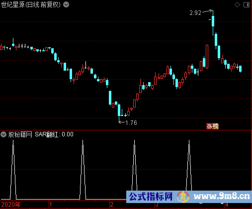 输出SAR翻红:收盘价上穿步长为2极限值为20的10日抛物转向