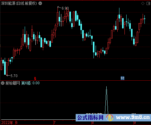 第6感:(IF(CROSS(动能曲线,GUODI) AND V > REF(V,1) AND C > M1 ,100,0)),LINETHICK1,COLORFFFFAA;