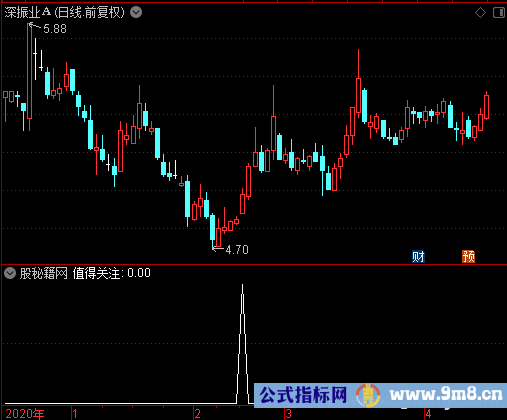 S赋值:成交量(手)的5日简单移动平均/成交量(手)的60日简单移动平均 A赋值:S的5日简单移动平均,画绿色,,线宽为2 BIAS赋值:(收盘价-收盘价的5日简单移动平均)/收盘价的5日简单移动平均*100 F赋值:S的121日简单移动平均 RSV赋值:(收盘价-45日内最低价的最低值)/(45日内最高价的最高值-45日内最低价的最低值)*100 K赋值:RSV的15日[1日权重]移动平均 D赋值:K的15日[1日权重]移动平均 J赋值:3*K-2*D S1赋值:如果(J<11ANDBIAS>-11ANDCROSS(S,F)AND(S-F)>0.010),返回2,否则返回0 输出值得关注:S1=2