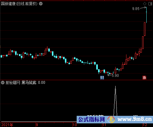 X1赋值:(((((3 * 收盘价) + 最高价) + 最低价) + 开盘价) / 6) X2赋值:X1的10日指数移动平均 X3赋值:1日前的X2 阻挡赋值:(最高价的21日[2日权重]移动平均 * 1.05) 牛熊线赋值:收盘价的250日简单移动平均 短期底部赋值:30日内开盘价的最低值 输出黑马筑底:(((((((最低价<=短期底部)AND(以收盘价计算的获利盘比例<0.2))AND(收盘价<牛熊线))AND(最高价<阻挡))AND((X2-1日前的X2)>0))AND(收阳线))AND(最高价>=X3))的5日过滤