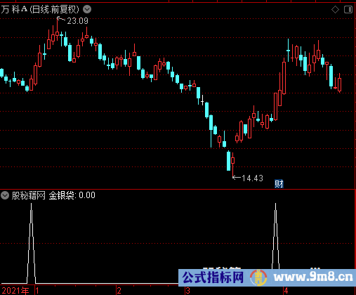 量比赋值:成交量(手)/1日前的成交量(手)的1日简单移动平均 多方力度赋值:3*(收盘价-27日内最低价的最低值)/(27日内最高价的最高值-27日内最低价的最低值)*100的5日[1日权重]移动平均-2*(收盘价-27日内最低价的最低值)/(27日内最高价的最高值-27日内最低价的最低值)*100的5日[1日权重]移动平均的3日[1日权重]移动平均,COLOR00FFFF,线宽为2 空方力度赋值:100*(55日内最高价的最高值-收盘价)/(55日内最高价的最高值-55日内最低价的最低值)COLOR00EC00,线宽为1 趋势线赋值:(收盘价的5日简单移动平均+收盘价的10日简单移动平均+收盘价的15日简单移动平均+收盘价的20日简单移动平均)/4 生命线赋值:收盘价的55日指数移动平均 输出金银袋:(收盘价>生命线 AND 最低价 <生命线 AND 收盘价>趋势线 AND 多方力度上穿空方力度 AND 收盘价/1日前的收盘价>1.02 AND 量比>1.1 AND 收阳线AND 最高价/开盘价和收盘价的较大值<1.05)