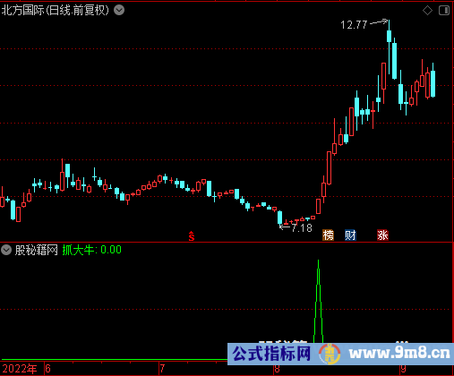 VAR2X赋值:(收盘价-9日内最低价的最低值)/(9日内最高价的最高值-9日内最低价的最低值)*100 VAR3X赋值:VAR2X的4日[1日权重]移动平均 VAR4X赋值:VAR3X的2日[1日权重]移动平均 VAR5X赋值:VAR4X的2日[1日权重]移动平均 VAR7赋值:VAR4X上穿VAR5X AND VAR4X<35 VAR8赋值:VAR7 AND 成交量(手)>1日前的成交量(手)*2 AND 成交量(手)>1日前的成交量(手)的5日简单移动平均*2 VAR01赋值:(收盘价-36日内最低价的最低值)/(36日内最高价的最高值-36日内最低价的最低值)*100 VAR02赋值:VAR01的3日[1日权重]移动平均 VAR03赋值:VAR02的3日[1日权重]移动平均 VAR04赋值:VAR03的3日[1日权重]移动平均 VAR06赋值:VAR03上穿VAR04 AND VAR03<25 VAR07赋值:VAR06 AND 成交量(手)>1日前的成交量(手)*2 AND 成交量(手)>1日前的成交量(手)的5日简单移动平均*2 HAN赋值:日期<1231230 VAR2XM赋值:(收盘价-18日内最低价的最低值)/(18日内最高价的最高值-18日内最低价的最低值)*100 VAR3XM赋值:VAR2XM的5日[1日权重]移动平均 VAR4XM赋值:VAR3XM的3日[1日权重]移动平均 VAR5XM赋值:VAR4XM的3日[1日权重]移动平均 VAR7M赋值:VAR4XM上穿VAR5XM AND VAR4XM<35 VAR8M赋值:VAR7M AND 成交量(手)>1日前的成交量(手)*2 AND 成交量(手)>1日前的成交量(手)的5日简单移动平均*2 VAR01M赋值:(收盘价-36日内最低价的最低值)/(36日内最高价的最高值-36日内最低价的最低值)*100 VAR02M赋值:VAR01M的3日[1日权重]移动平均 VAR03M赋值:VAR02M的3日[1日权重]移动平均 VAR04M赋值:VAR03M的3日[1日权重]移动平均 VAR06M赋值:VAR03M上穿VAR04M AND VAR03M<25 VAR07M赋值:VAR06M AND 成交量(手)>1日前的成交量(手)*2 AND 成交量(手)>1日前的成交量(手)的5日简单移动平均*2 ASDM赋值:当满足条件VAR8MORVAR07M时,在-2和25位置之间画柱状线,宽度为4,0不为0则画空心柱. ASDMM赋值:当满足条件VAR8ORVAR07时,在0和20位置之间画柱状线,宽度为6,0不为0则画空心柱.*HAN MHY赋值:当满足条件ASDMANDASDMM时,在0和20位置之间画柱状线,宽度为6,0不为0则画空心柱.*HAN 底部赋值:MHY的15日过滤 输出抓大牛:底部,画绿色