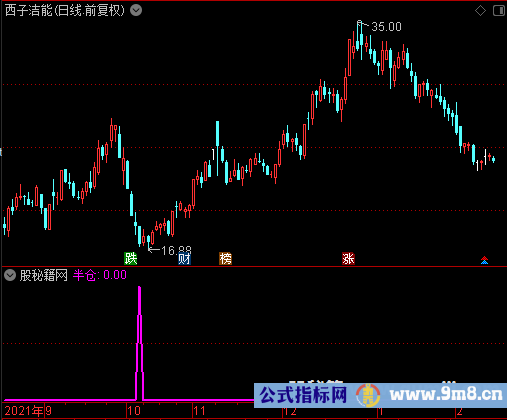半仓:IF(((ZJZ>0 AND JBJ>0 AND SUM(VOL/CAPITAL*100,5)/5<1) OR (CXC>0 AND REF(C,1)/REF(C,2)>0.902)) OR (((ZJZ>0 AND JBJ>0 AND SUM(VOL/CAPITAL*100,5)/5<1) OR CXC>0) AND (LXL<0 OR LGL>0)) AND VMC<10 ,100,0),COLORMAGENTA,LINETHICK2;