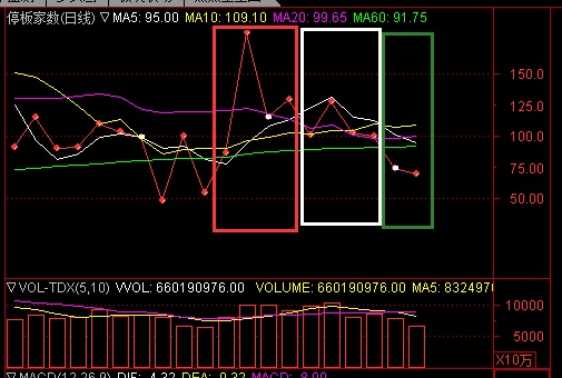 我们可以看到,红框内,第一天指数大阳,但是涨停家数不多,错配。第二,三,四天是相配。白色框和绿色框内,其实算是相配的。但是,白色框内的实际情况却是,打板的人天天第二天开盘割肉,尾盘拉板,而低吸的人在白色框内这几天是天天吃大肉。到了绿色框内,指数横盘几日后下跌,打板和低吸的人都亏惨了。