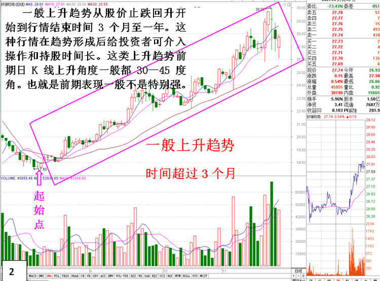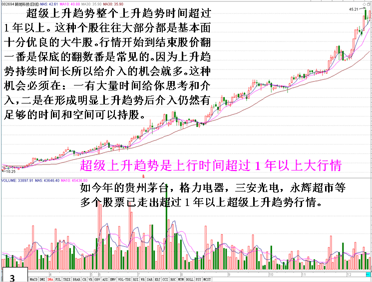 小上升趋势是指从股价止跌回升开始到行情结束,整个上升趋势时间持续在3个月内的。一般上升趋势指从股价止跌回升开始到行情结束,上升趋势持续时间3个月以上至1年之内。超级上升趋势指整个上升趋势持续时间超过1年的。