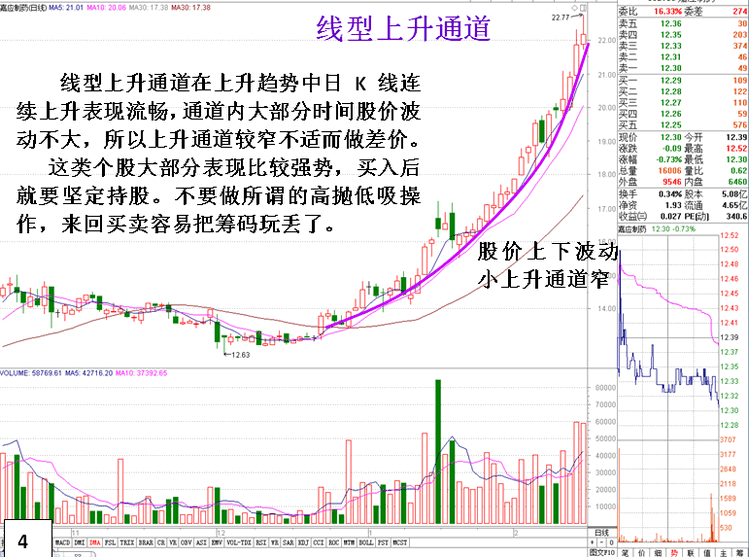 线型上升通道 指在上升趋势中日K线连续上升表现流畅,整个上升通道内大部分时间股价上落波动不大上升通道较窄,故称为线型上升通道。
