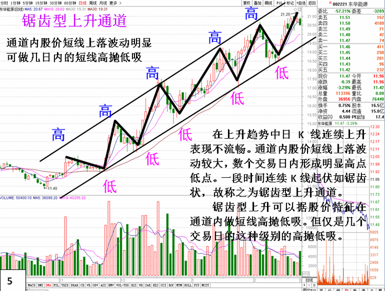 锯齿型上升通道 指在上升趋势中日K线连续上升表现并流畅。整个上升通道内股价上落波动明显,比线型上升通道明显更宽。股价上落波动短线数日内会形成明显高低点,连续K线形状如锯齿状,故称之为锯齿型上升通道。