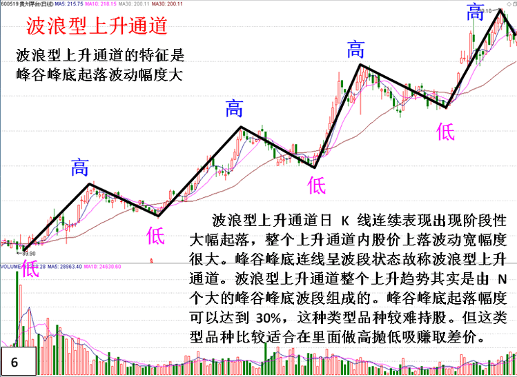 波浪型上升通道 指在上升趋势中日K线连续上升表现,日K线呈现出阶段性大幅起落通道内股价上落波动大。一段时间内日K线形成非常明显波段性起落高低点,故称之为波浪型上升通道。