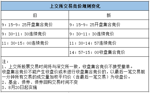 根据上交所此前发布的《上海证券交易所交易规则》等五项调整后的业务规则,自今日(8月20日)起调整股票收盘交易机制,通过3分钟集合竞价方式产生收盘价,收盘集合竞价阶段为14:57至15:00。