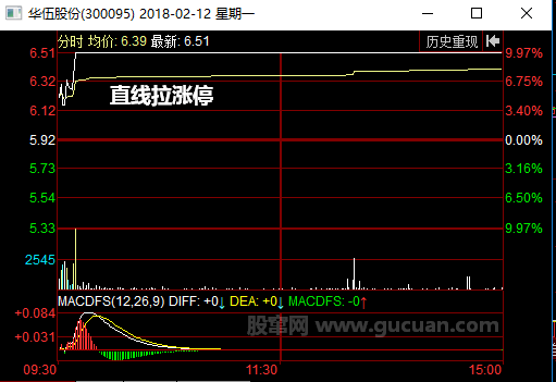 部分股票虽然在开盘时没有直接涨停,但是开盘后的某个时间,市场上的买方力量突然十分强势,开始持续将股价向上拉升。股价持续上涨至涨停价位,中间没有明显的回落。这样的形态说明市场上的买入力量非常强势,大量买盘突然出现,是看涨买入信号。   当分时图形成这样的涨停形态时,往往对应着K线图上形成大阳线。同时因为买方力量强势将行情向上拉升,持续突破了上方的阻力位,这样的形态会带来成交量持续大幅放大。当分时线最终被封上涨停时,往往也是这个交易日中成交量最大的时刻。   如图所示,2018年2月12日,华伍股份(300095)经过开盘阶段小幅回落后,大量买盘涌出,将行情强势拉升至涨停板。这样的形态说明市场上的买方力量十分强势,在这个过程中,大量投资者买入股票,股价突破了上方的阻力位,该股的成交量也大幅放大。