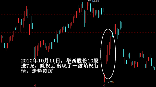 一般来说,除权后股价能够大涨甚至涨停,成交量却保持稳定,很可能会出现填权行情。现在有专门的分析师在研究哪些股票可能会有高送转,我觉得他们圈定的范围太大,反而我比较喜欢在次新股的中小板和创业板中找股价整体趋势向上,价格相对较高,盈利增长较快的股票,他们可能在年终分红里实施高送转。如图,华西股份(000936)画圈部分出现了填权行情。